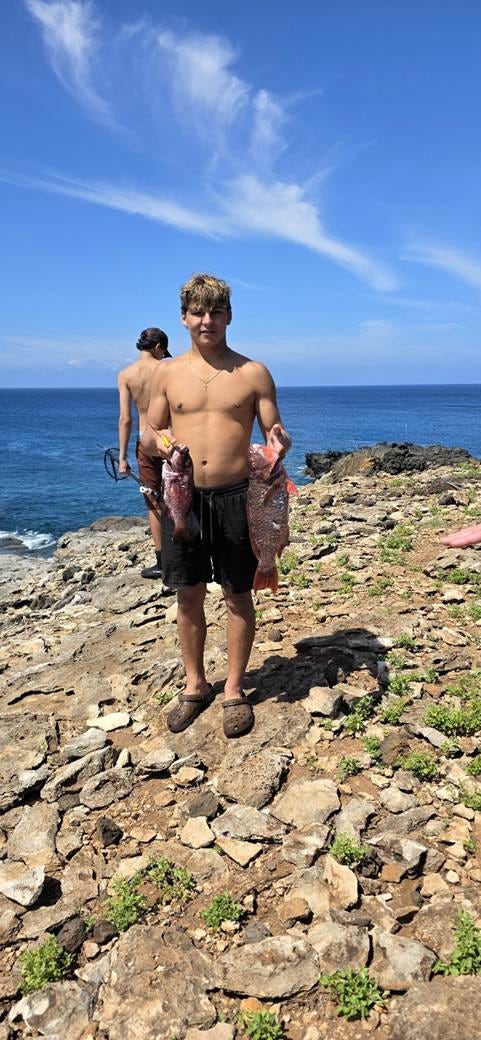 [Another spear fisherman. He told us he dove 30 ft down and held his breath for 90 seconds to make the catch. Also, no gear.]