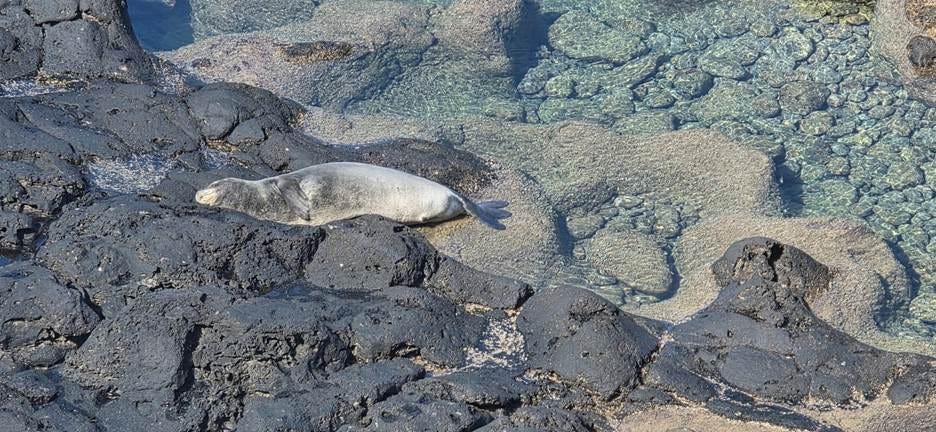 [Although we saw plenty of marine life, nothing moved me as much as the monk seals that found resting places along the shore. Many of them are females in labor just taking a rest. Photo and video by njhess]