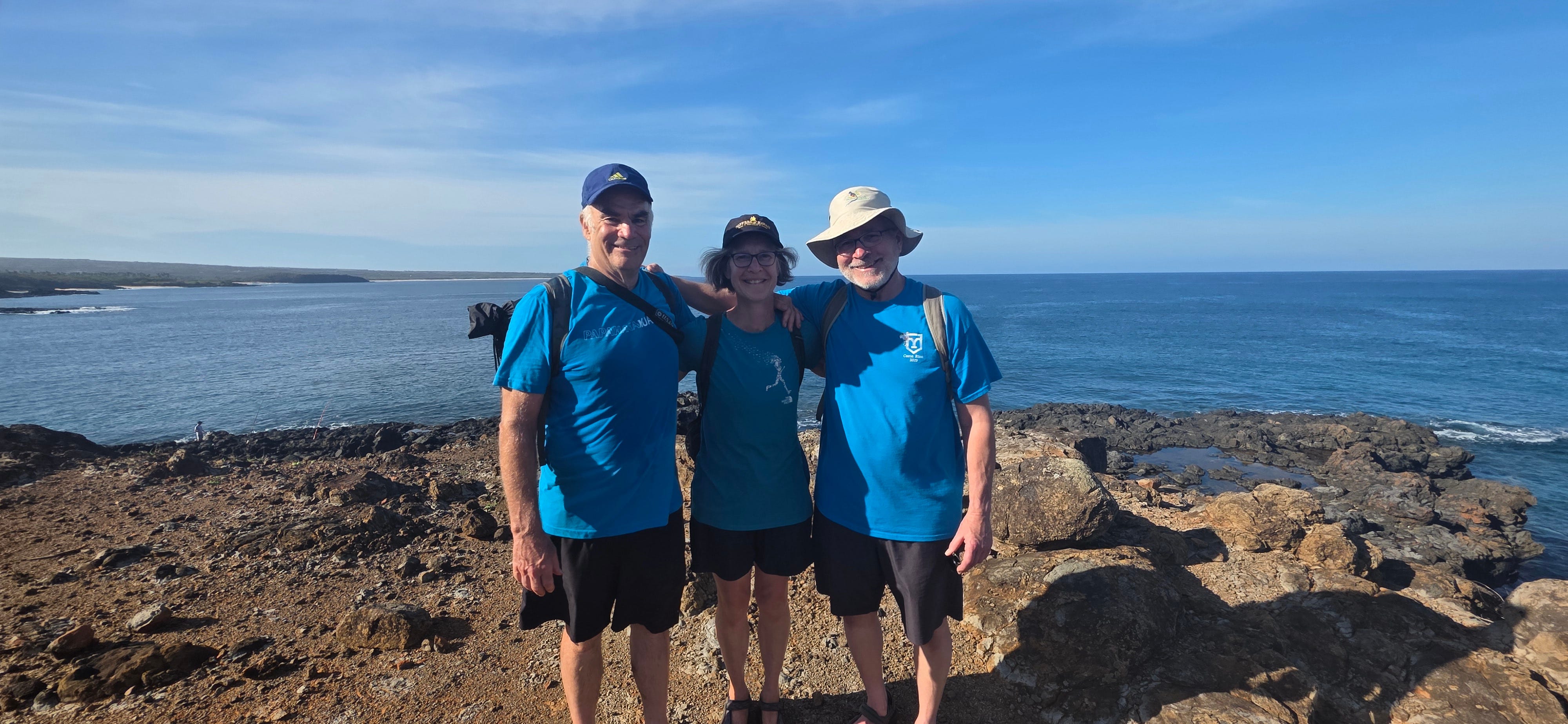 [Our intrepid hosts and my fellow traveller on a hike that took us over miles of volcanic rock and beach.]