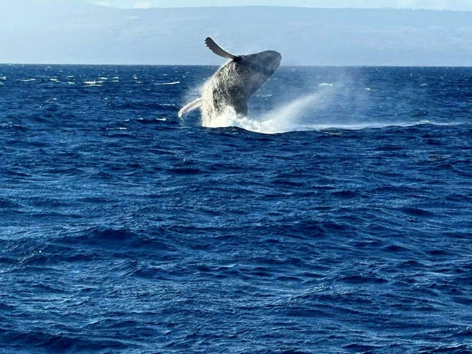 [Male whale breaching following a brilliant display of momma training baby whale. Just a signal to let us know who was in charge. These whales travel from Alaska to these specific waters near Molokai to give birth. Photo by watching mate who generously shared her “catch”.]