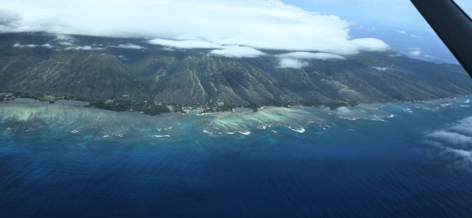 [East end of Molokai, from our plane. Note the intact reef apron that frames the coastline. There is one two lane road that follows the edge of the island. Travel is slow but you see locals pulled over to the side of the roads and encampments that conjure up community gathering. Note too the ridges and crevices that result from the early volcanic formations of the island. Photo by njhess]